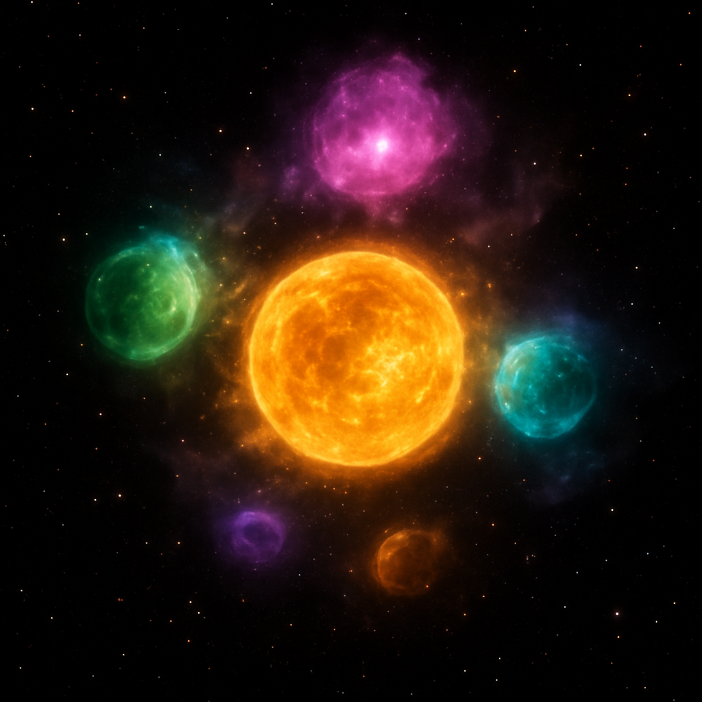- Vergehen (braun und gelb): Der Übergang zu braunen und gelben Farben könnte auf das spätere Stadium eines Sterns hinweisen, in dem er kühler wird und seine äußeren Schichten abstößt, möglicherweise als planetarer Nebel.